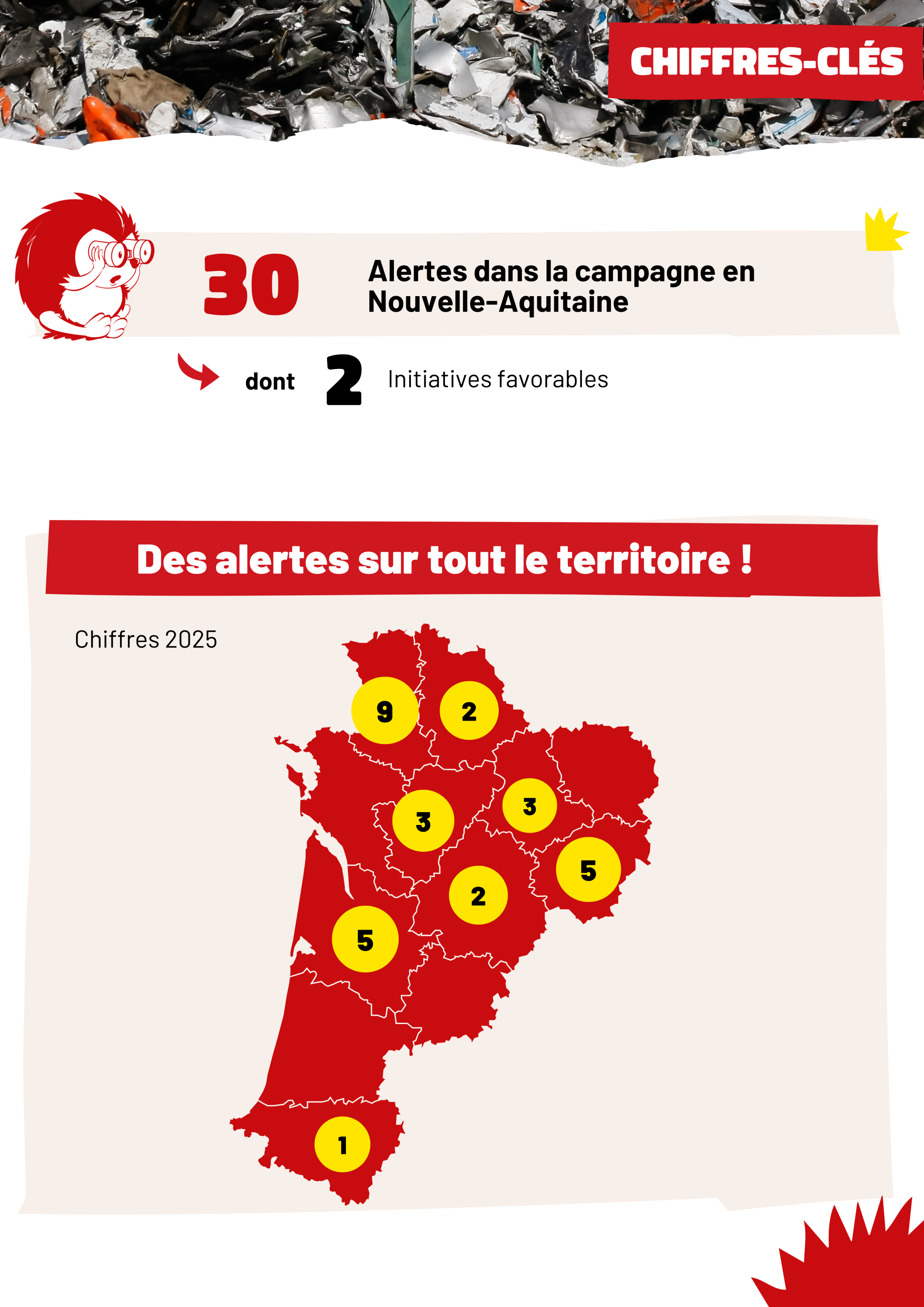 Sur les 12 départements de Nouvelle-Aquitaine, 30 signalements ont été reçus sur la plateforme Sentinelles de la Nature dans le cadre de cette campagne Eaux Déchets. 28 d’entre eux visent des dépôts de déchets dans ou près des cours d’eau. 2 signalements d’initiatives favorables nous sont parvenus :