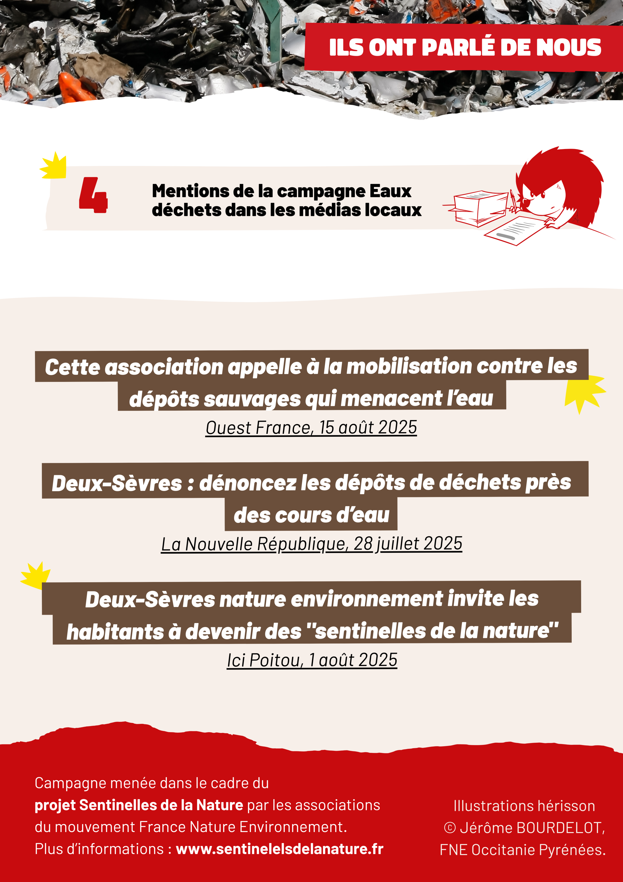Les médias locaux (ici Poitou, La nouvelle République, Ouest France, Euroradio) ont également contribué à nos actions de communication sur les déchets aux abords des milieux aquatiques.